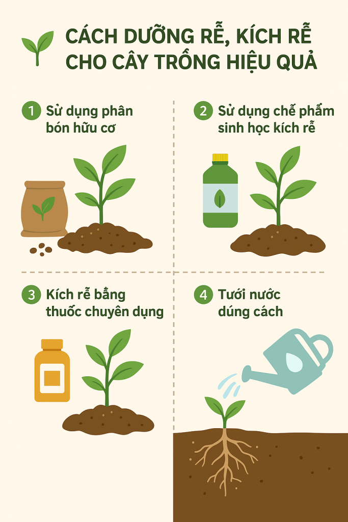 Hiện nay có nhiều sản phẩm kích rễ chuyên dụng như N3M, Root 2, Super Root hoặc Atonik. Những dung dịch này chứa hormone và khoáng chất giúp rễ phát triển nhanh chóng. Khi dùng, cần tuân thủ đúng liều lượng để tránh gây sốc cây. Sử dụng kết hợp cùng phân bón lá hoặc vi sinh sẽ tăng hiệu quả nuôi rễ, kích chồi mạnh mẽ.