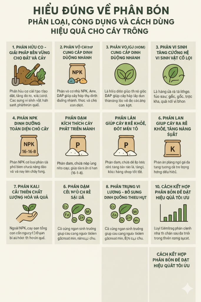 Mỗi loại phân bón có vai trò riêng, do đó cần phối hợp hợp lý theo từng giai đoạn sinh trưởng. Giai đoạn đầu ưu tiên phân hữu cơ và lân; giai đoạn sinh trưởng dùng NPK, đạm; giai đoạn ra hoa dùng kali và vi lượng. Kết hợp đúng cách giúp cây phát triển bền vững, tăng năng suất và chất lượng nông sản.