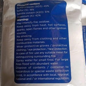 Sản phẩm chứa 51% Kali (K₂O) giúp tăng khả năng ra hoa, đậu trái và phát triển rễ, kết hợp với 17.5% lưu huỳnh (S) giúp tăng khả năng hấp thu dinh dưỡng và nâng cao hương vị, màu sắc trái cây, rau củ.